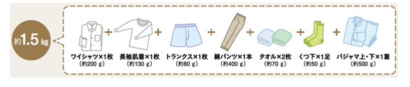 具体的にはワイシャツ、肌着、下着、靴下、パジャマをそれぞれ1着として、合計すると1.5キロ位になります。